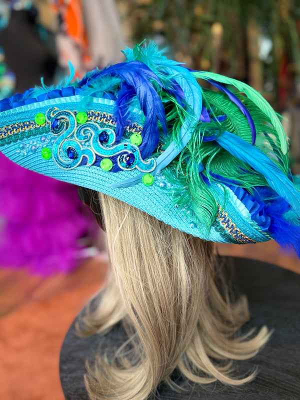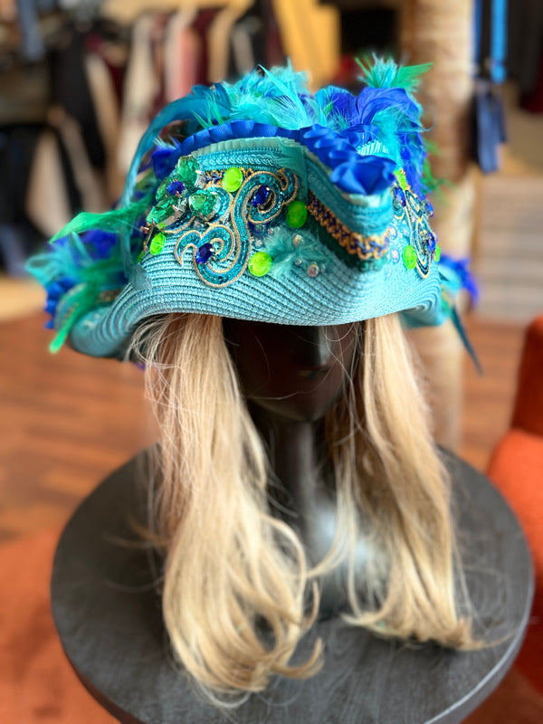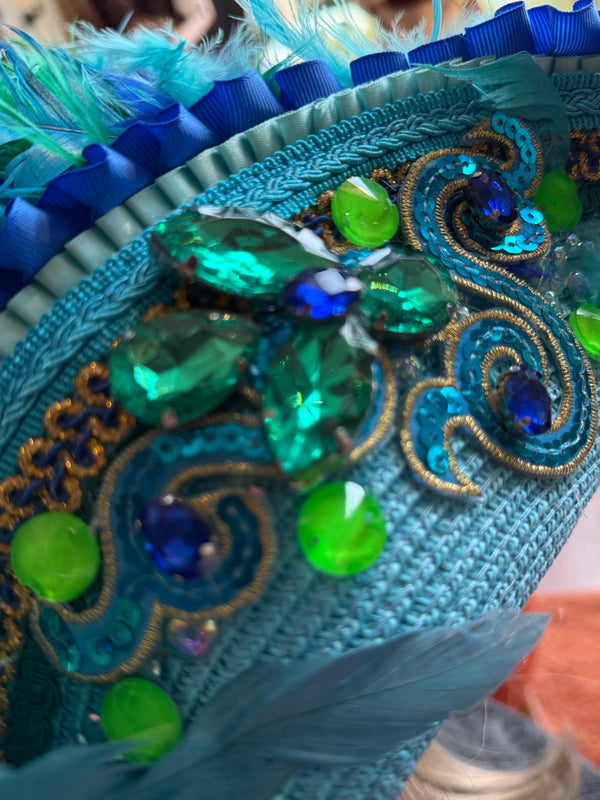 Aufwändig bearbeiteter Strohhut in den schönen Aquafarben türkis, royalblau und grün.