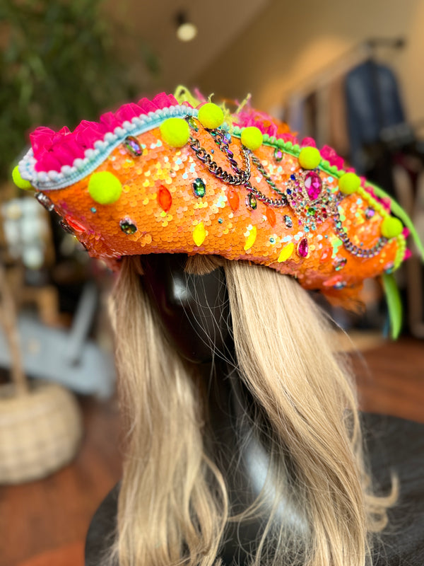 Bearbeitet mit an der Kante mit orangefarbenden Paillettenstoff, Borten und Ketten.